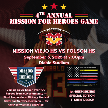 We are proud to host our 4th Annual Mission For Heroes Game as Mission Viejo HS takes on Folsom HS on Friday, September 5, 2025, at 7:00 PM in Diablo Stadium! ππ₯